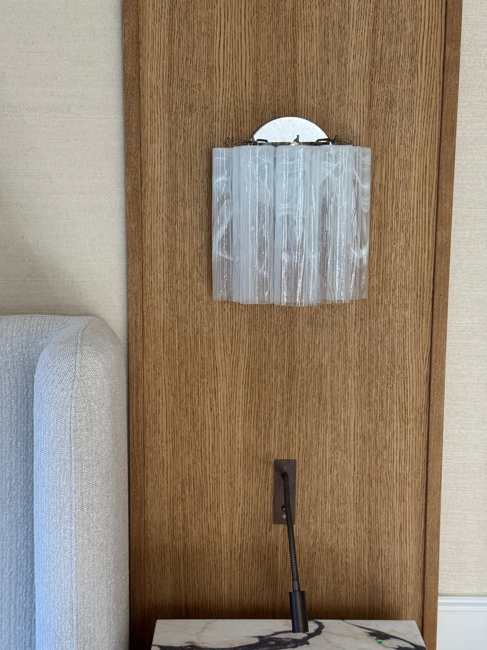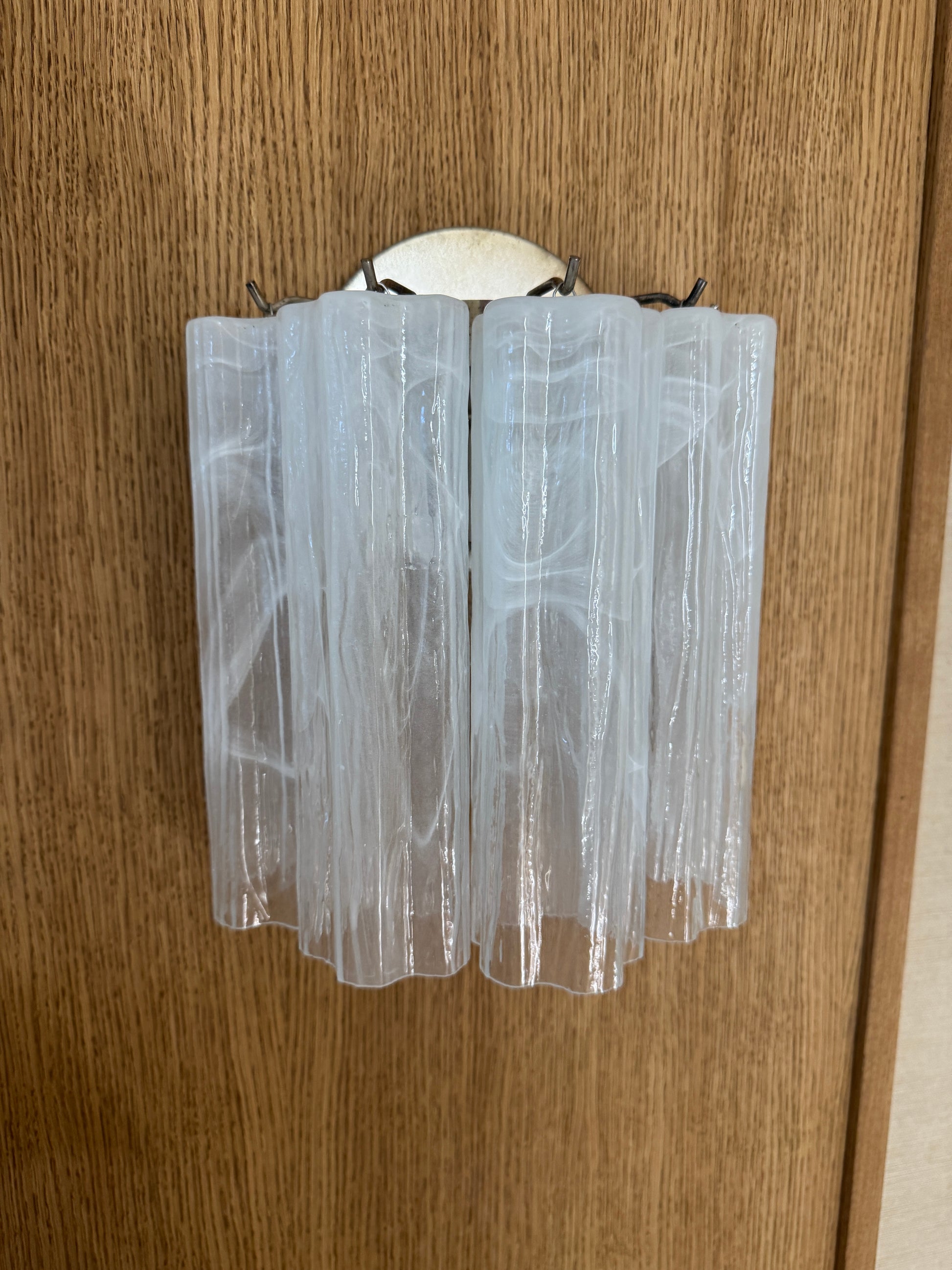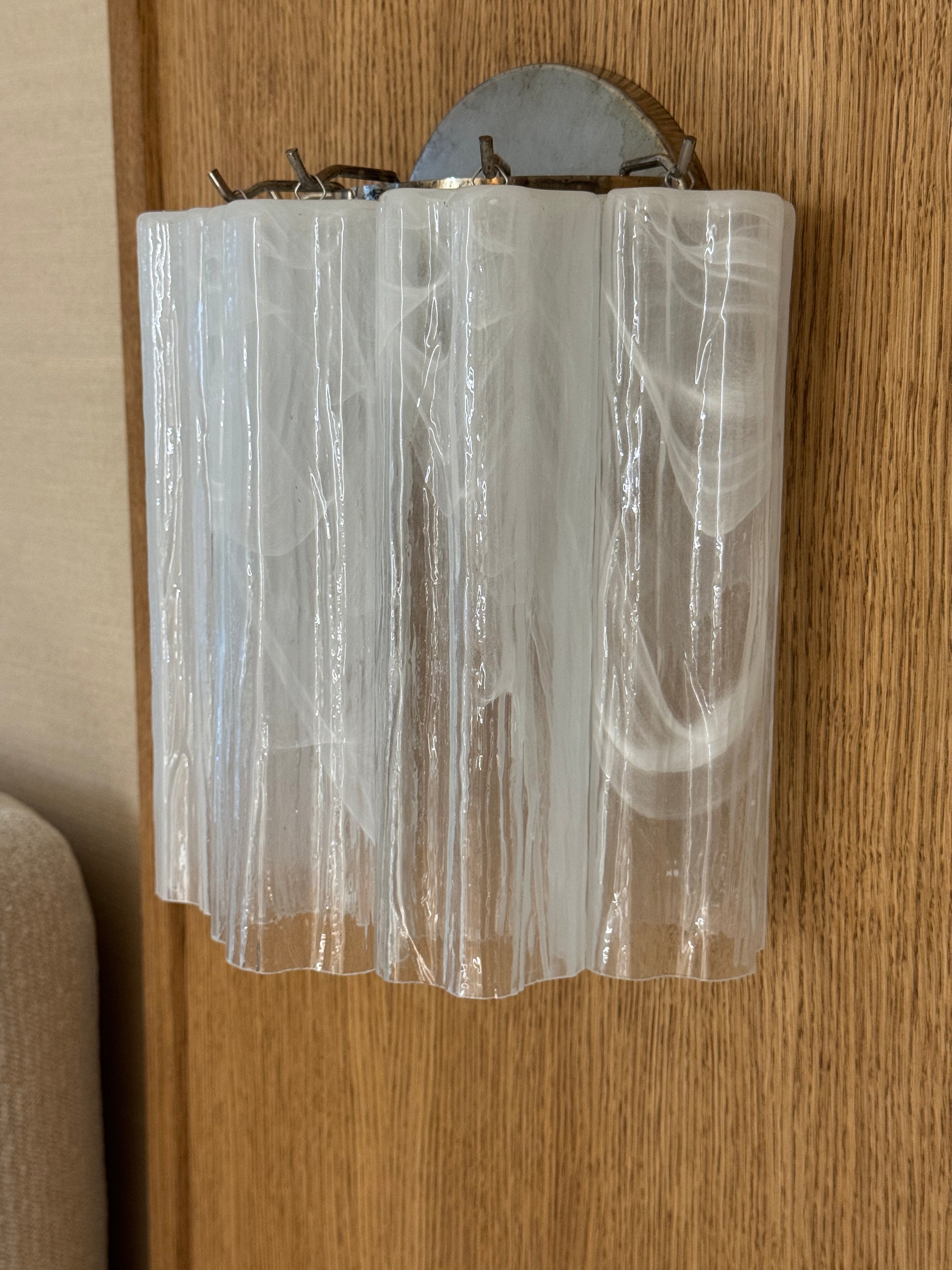 Italiensk vägglampa från Murano, med strukturer i förnicklad metall och fem stora rörformade glas. Glasen är formade i ett elegant stjärnmönster och tillverkade med den traditionella alabastertekniken – en metod utvecklad i venetianska glasbruk som ger glaset en mjuk, ådrad yta med karaktär. Lamporna säljs styckvis.